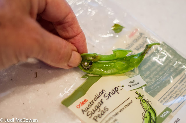 Yep. A grub. Now, I love my protein, but I'm really not into this type of protein! If I had not been de-podding my peas I would never have found this little chap and would most certainly have gobbled it down and probably never even knew what I was eating. So the moral to this little story is to check all your vegetables for any blemishes, i.e. holes in sugar snap peas like this............